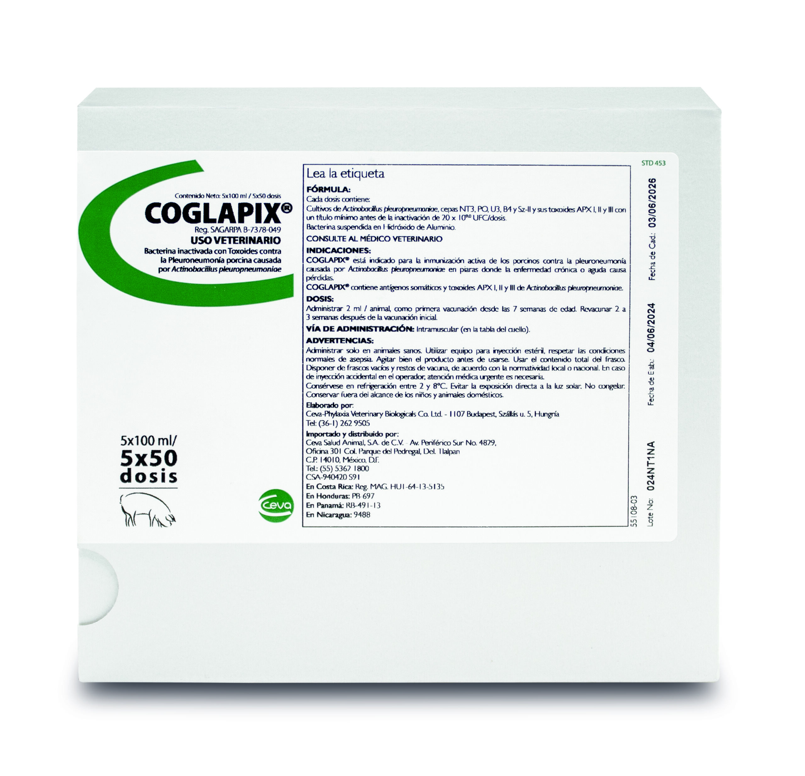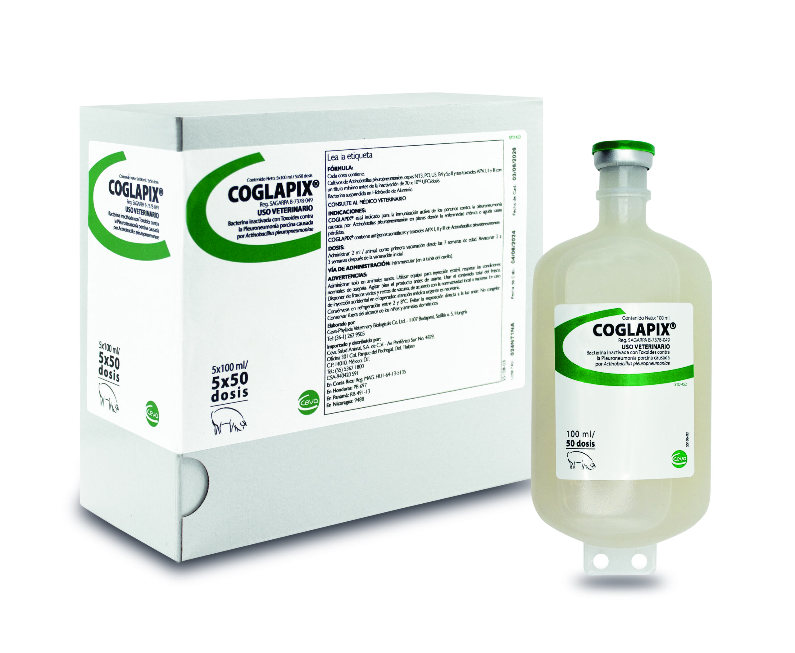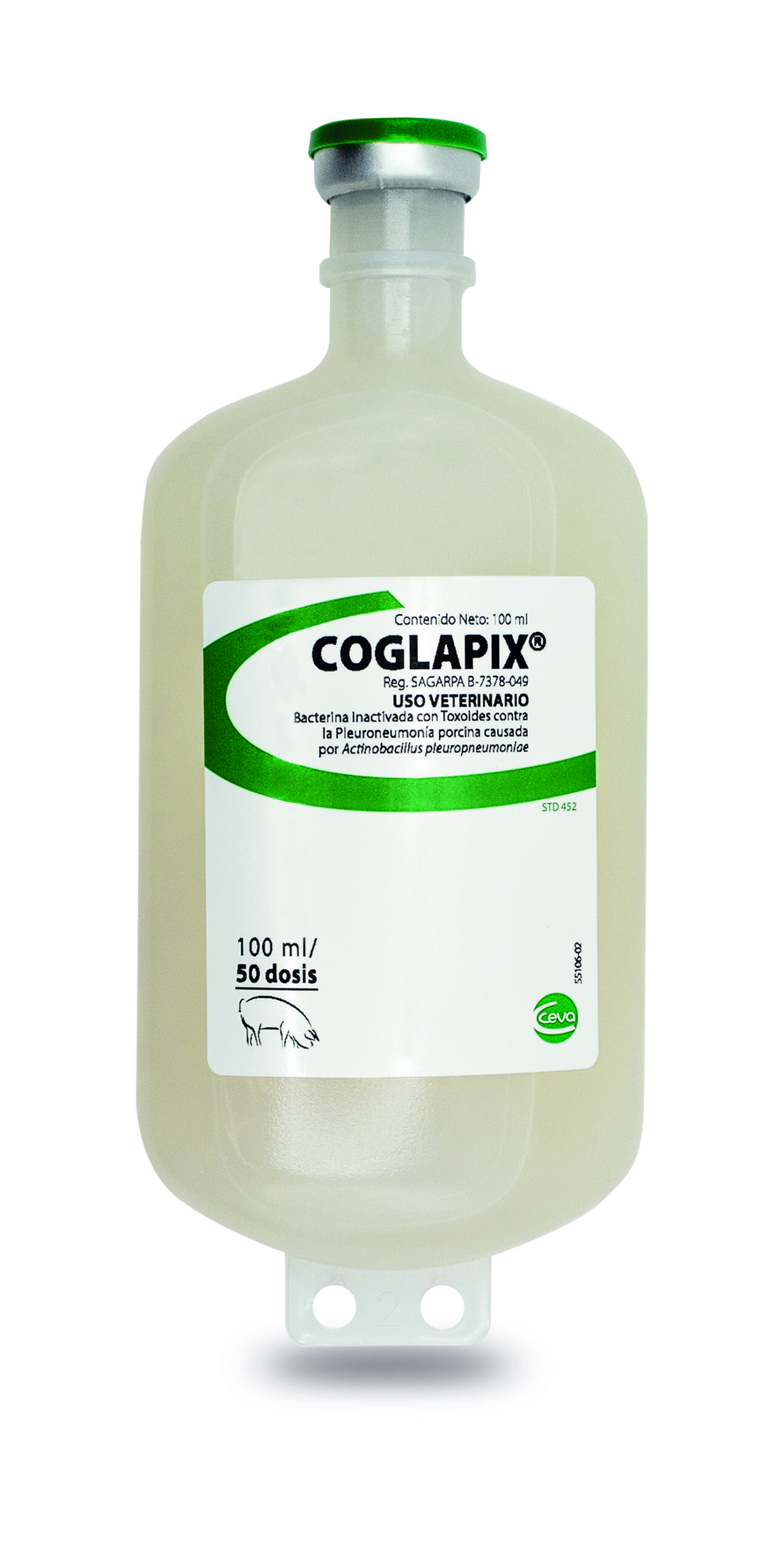 Coglapix® es una Bacterina inactivada formulada con componentes de la membrana de los serotipos 1 y 2 de Actinobacillus pleuropneumoniae y expresa las tres toxinas APX (ApxI, ApxII, ApxIII).